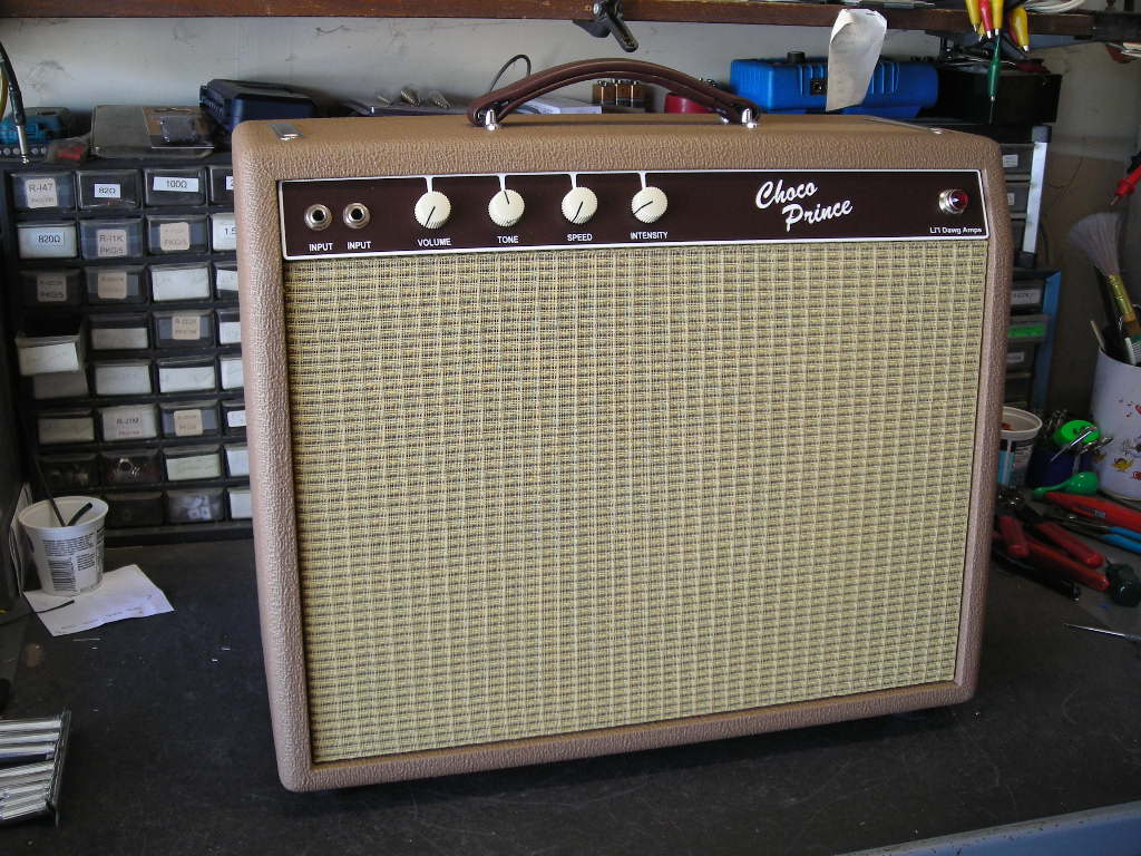 The ChocoPrince is based on the 6G2 Brown Princeton circuit and is another example of the transitional amps between the tweed and the blackface models. So what you get is the fatter tone of the tweeds with more gain like the blackface amps from the two 12AX7s in the pre-amp section. Add in fixed bias for a tighter feel, plus the foot switch-able tube bias modulated tremolo, and you have a smaller amp suitable for recording, home, or taking to the club for a gig.