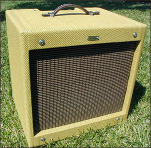So now I had the amp, but the Champ’s only had a 8″ speaker in a very small cabinet. They were great with a mic in front of them, but on their own they didn’t have much volume. So I tried different cabinet designs out and finally ended up with a cabinet large enough for a 12″ speaker, slightly deeper than most, and with a ¾ back for some punch. I used 1″solid pine for the cabinet and 3/8″ Baltic birch plywood for the sound board and back panels, dovetailed the joints for strength, covered them with good quality tweed obtained from a restoration shop, then gave them a four coats of polyurethane (1 coat of 50/50 honey pine & 3 coats of clear). Add a quality leather handle, stainless steel hardware, and the cabinets closely resemble a wide panel tweed amp of the late 50’s plus they sound great.